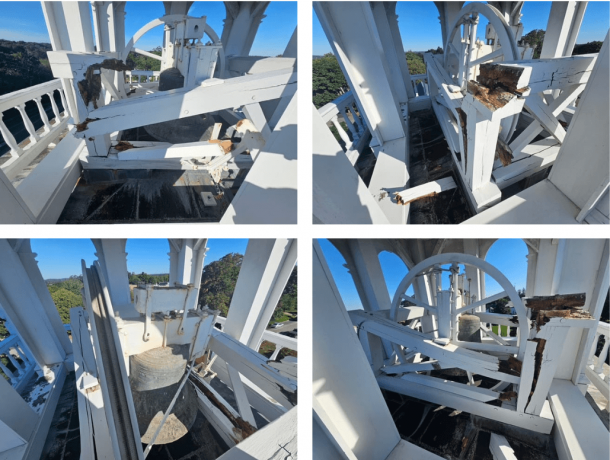 In late summer, we discovered that the church bell would no longer ring when the ropes were pulled. We had hoped for a simple solution- maybe the rope came off the wheel, or it had frayed?- but alas that was not the case. You’ll see a few photos of what we found when we went up to the bell tower. The good news is that the bell itself is unscathed- the bad news is the entire enclosure needs to be rebuilt. As the bell tower was renovated 20 years ago, there were concerns that the structural supports perhaps weren’t holding up, or there were other issues that needed to be addressed before rebuilding. We hired a structural engineer to review the tower, and he ensured us that this damage was due to weather related wood rot and wood choice. This was great news- it meant a contained repair with no core structural issues in the tower. However, by the time this was determined, it was too late into the fall to be able to complete this repair with the cold (the repair is expected to take approximately 3 weeks). Our plan is to do the work as early as possible in the spring, with the goal of having the bell ringing by Earth Day 2026. In the meantime, please do not go up to the bell tower for your own safety, and thank you for your patience as we carefully went through the process of determining how best to care for our beautiful bell.